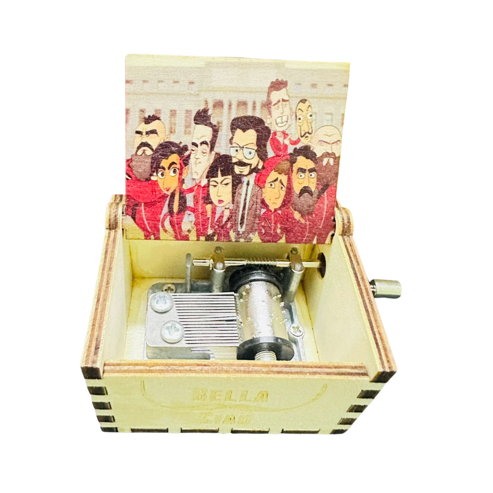 Ao girar a manivela lateral, a caixinha toca a clássica melodia “Bella Ciao”, que se tornou o hino dos personagens e conquistou o público no mundo todo. O mecanismo manual dispensa pilhas e proporciona um toque nostálgico e artesanal.