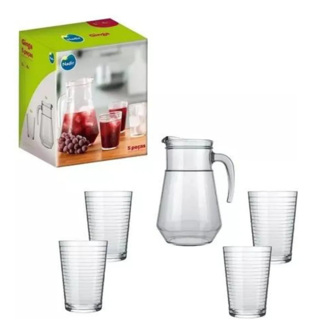 Apresentamos o Jogo De Jarra E Copos De Agua E Suco Ginga Nadir 5 Pecas, uma adição elegante e funcional para a sua casa. Fabricado pela renomada marca Nadir Figueiredo, este conjunto é feito de vidro de alta qualidade, garantindo durabilidade e resistência. A jarra tem uma capacidade de 1,5 L, perfeita para servir suas bebidas favoritas, seja água ou suco. O conjunto inclui também quatro copos, todos com um diâmetro de 16,3 cm e altura de 21,7 cm, proporcionando a quantidade certa de bebida para você e seus convidados. O design sofisticado deste conjunto de jarra e copos adicionará um toque de elegância a qualquer ocasião. Ideal para uso diário ou para entretenimento, este conjunto é uma escolha perfeita para qualquer casa.