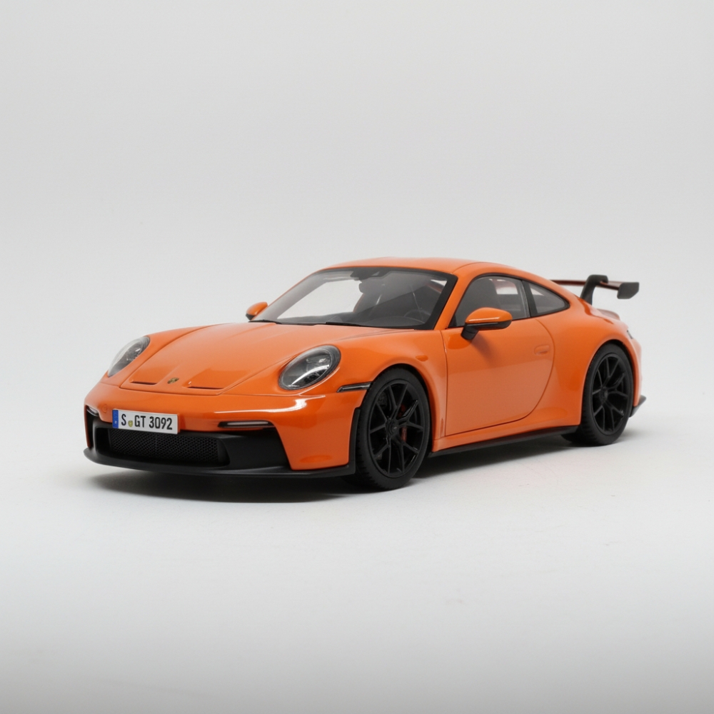 Com pintura laranja vibrante, aerofólio traseiro esportivo e interior detalhado, o modelo transmite toda a essência do lendário 911 GT3, um dos esportivos mais desejados do mundo.